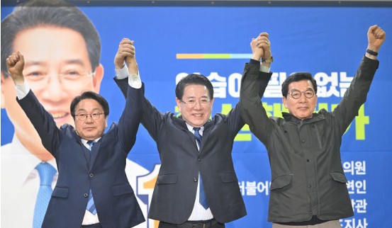 더불어민주당 전남광주통합특별시장 경선에 참여했던 김영록·신정훈·강기정 후보가 하나로 뭉쳐 경선 승리를 다짐했다.신 후보와 강 후보는 9일 오후 광주 서구 김 후보의 선거…