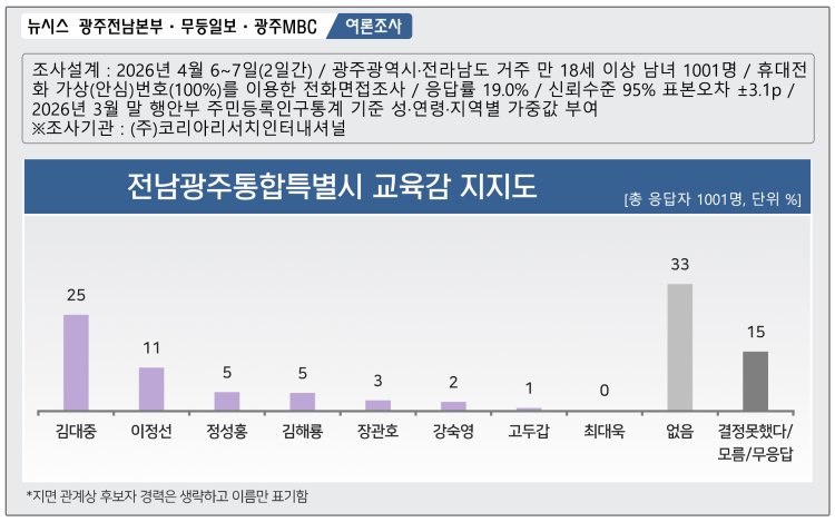 6월3일 제9회 전국동시지방선거를 두 달여 앞두고 전남광주특별시교육감 후보 선호도를 조사한 결과 김대중 전남도교육감이 이정선 광주시교육감을 비롯한 경쟁 후보들을 오차범위 밖에서 앞…