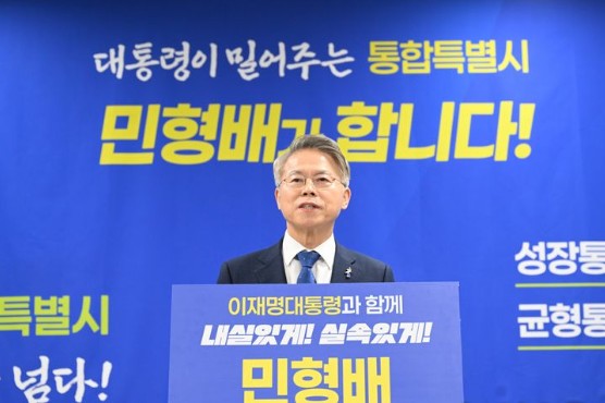 더불어민주당 민형배(광주 광산을)의원이 2일 오전 광주 서구 치평동 광주시의회 브리핑룸에서 전남광주통합특별시장 출마 기자회견을 하고 있다'바람'이 '조직'을 이겼다.인구…
