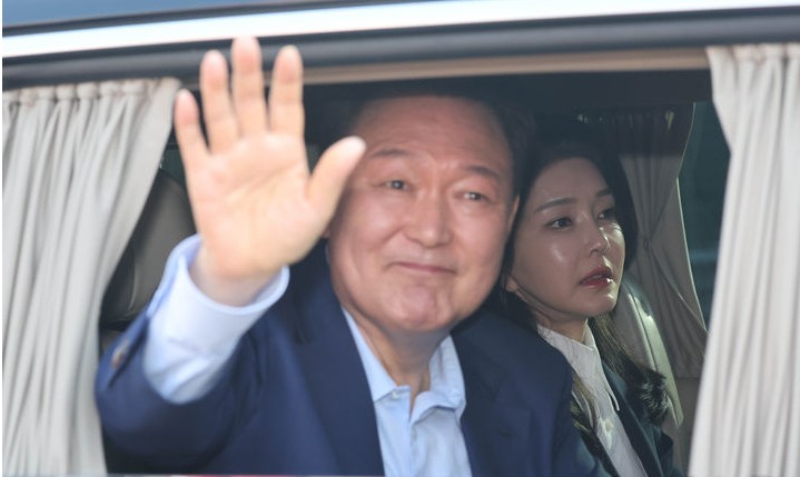 윤석열 전 대통령의 불법 여론조사 수수 혐의 재판에 김건희 여사가 증인으로 출석했다. 각각 구속기소된 전직 대통령 부부는 9개월 만에 법정에서 재회했다. 사진은 윤 전 …