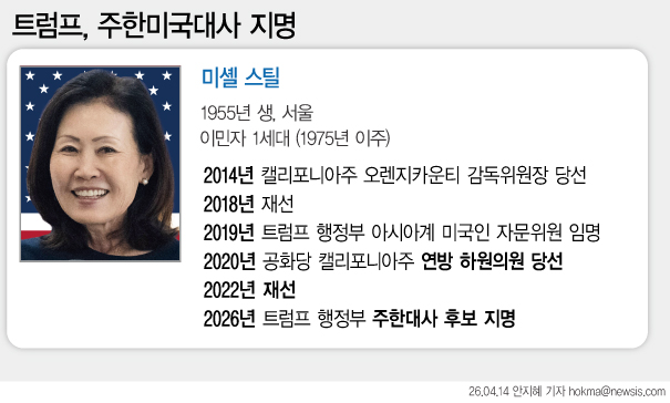 도널드 트럼프 미국 대통령이 13일(현지 시간) 주미대사 후보로 한국계 정치인인 미셸 스틸(한국명 박은주) 전 하원의원을 지명했다고 백악관이 밝혔다. (그래픽=안지혜 기자)외교부는…