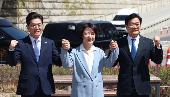 더불어민주당 정원오 서울시장 후보, 추미애 경기도지사 후보, 박찬대 인천시장 후보가 12일 서울 여의도 국회 소통관 앞 벤치에서 열린 수도권 광역단체장 후보 '원팀 간담회'에서 기념촬영을 하고 있다.