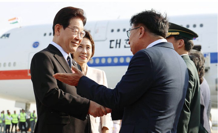 인도를 국빈 방문한 이재명 대통령이 19일(현지 시간) 인도 팔람 공군공항에 도착해 환영 인사들과 인사하고 있다.이재명 대통령은 20일(현지시간) 인도 뉴델리의 라슈트라파티 바반 대통령궁에서 열린 공식 환영식에 참석했다.