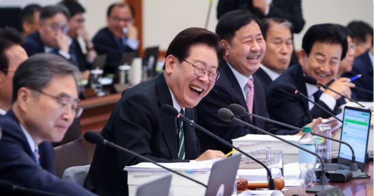 이재명 대통령이 28일 청와대에서 열린 국무회의 겸 비상경제점검회의에서 밝게 웃고 있다. (청와대통신사진기자단)이재명 대통령은 28일 오는 6·3 재보궐선거에 출마하는 청와대 하정우 AI미래기획수석과 전은수 대변인 사직안을 재가했다.