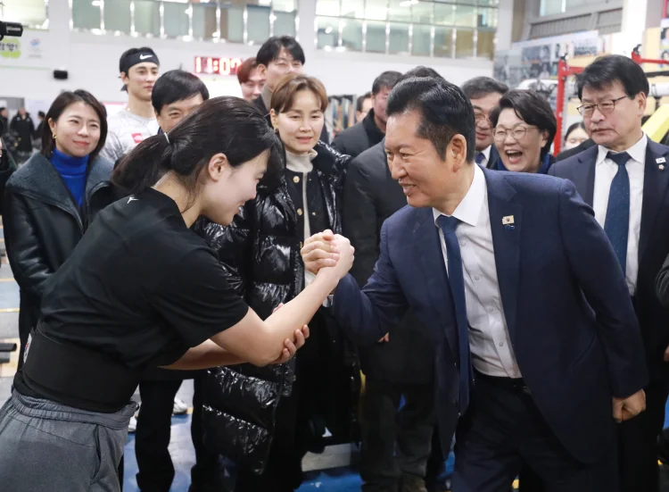 정청래 더불어민주당 대표가 23일 충북 진천국가대표선수촌 웨이트트레이닝장을 방문해 선수를 격려하고 있다. (사진= 공동취재)