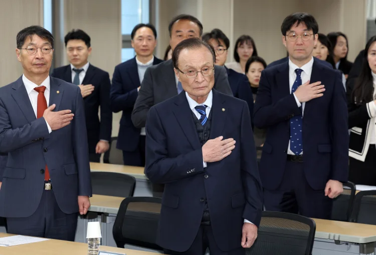 이해찬 민주평화통일자문회의 수석부의장이 3일 오전 서울 중구 민주평통사무처에서 열린 취임식에서 국민의례를 하고 있다.국민의힘은 25일 이해찬 민주평화통일자문회의 수석부의장(전 국무총리)의 별세 소식에 애도를 표했다.
