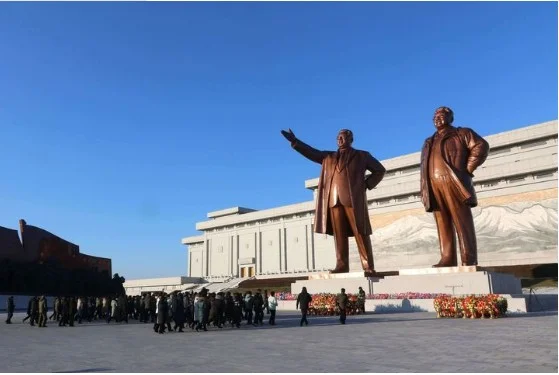 1월 1일 북한 평양에서 시민과 군인들이 새해를 맞아 만수대 언덕의 김일성 주석과 김정일 국방위원장 동상을 참배하고 있다