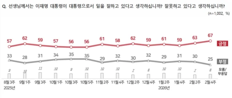 이재명 대통령의 국정 지지도가 직전 조사보다 4%포인트 상승한 67%를 기록했다는 여론조사 결과가 26일 나왔다.