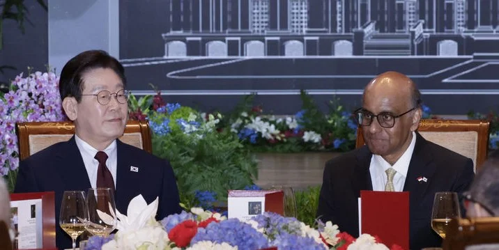싱가포르를 국빈 방문 중인 이재명 대통령이 2일(현지 시간) 한 호텔에서 열린 국빈만찬에서 타르만 샨무가라트남 대통령과 자리하고 있다싱가포르를 국빈 방문 중인 이재명 대통령이 2일(현지 시간) 한 호텔에서 열린 타르만 샨무가라트남 대통령과 국빈만찬에서 답사를 하고 있다.
