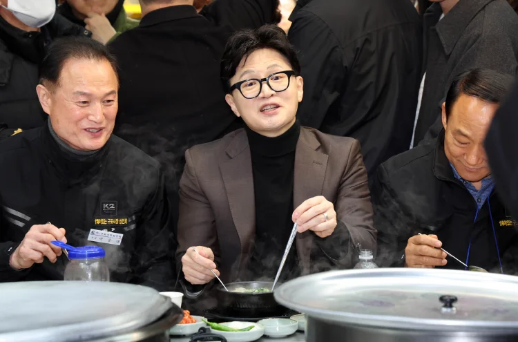 한동훈 전 국민의힘 대표가 7일 부산 북구 구포시장을 방문, 상인 대표등과 국밥을 먹고 있다.