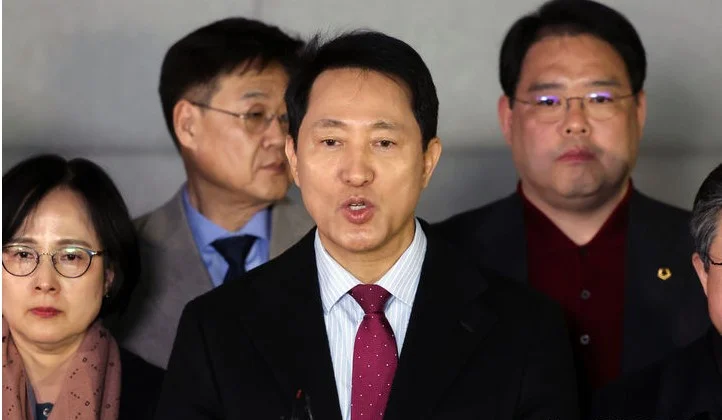 오세훈 서울시장이 9일 오후 서울 중구 서울시청 인근에서 김길성 중구청장 및 시의원 등 관계자들과 함께 국민의힘이 이날 발표한 결의문과 관련해 입장을 밝히고 있다.앞서 국민의힘은 이날 열린 의원총회에서 윤석열 전 대통령의 정치적 복귀에 반대한다는 결의문을 채택했다.
