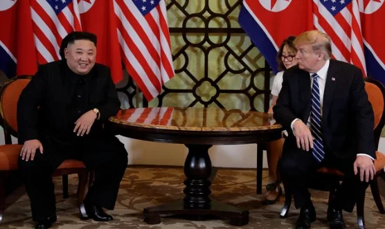2019년 2월 28일(현지 시간) 김정은 북한 국무위원장과 도널드 트럼프 미국 대통령이 하노이 메트로폴 호텔 회담장에서 회담하고 있다[워싱턴=뉴시스] 이윤희 특파원 = 미국 재무부가 도널드 트럼프 대통령의 중국 방문을 앞두고 대북 추가제재를 발표했다.
