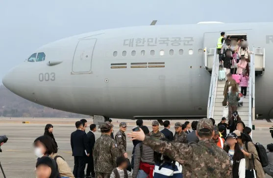 이날 오후 5시 59분께 성남 서울공항에 착륙한 군 수송기가 활주로에서 이동하는 동안 교민들은 수송기 안에서 창밖으로 손인사를 건넸고, 일부는 수송기 창문에 얼굴을 바짝 대고 가족이 마중 나왔는지 확인하는 모습도 보였다.