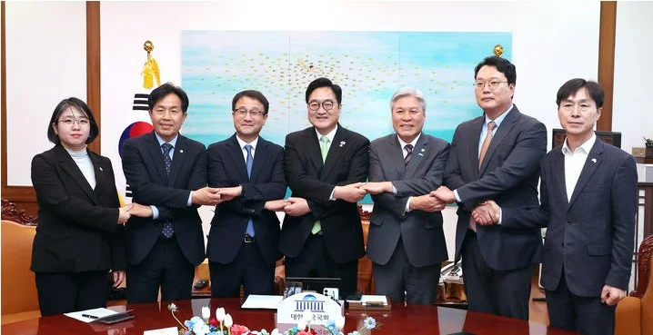 우원식 국회의장이 19일 국회의장실에서 원내 6개 정당 원내대표들과 회동하기에 앞서 기념 촬영을 하고 있다. 왼쪽부터 기본소득당 용혜인 원내대표, 진보당 윤종오 원내대표, 더불어민주당 한병도 원내대표, 우원식 국회의장, 조국혁신당 서왕진 원내대표, 개혁신당 천하람 원내대표, 사회민주당 한창민 원내대표.(공동취재)