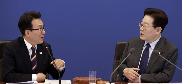 이재명 대통령이 24일 청와대에서 열린 국무회의에서 김민석 국무총리와 대화하고 있다.정부가 중동 사태 장기화로 에너지 수급 불안 가능성에 대비해 김민석 국무총리를 중심으로 한 범정부 차원의 비상경제 대응체제를 선제적으로 가동한다.