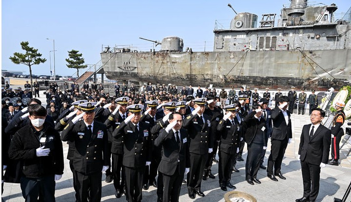 26일 평택 해군제2함대사령부에서 열린 제 16주기 천안함 46용사 추모식에서 최원일 전 천안함장과 참전용사들이 천안함 46용사에게 경례를 하고 있다. (사진=해군2함대 제공)전수미 더불어민주당 대변인은 28일 "국민의힘은 천안함 유가족의 아픔을 선거용 정쟁 도구로 쓰는 패륜적 행태를 즉각 중단하라"고 했다.