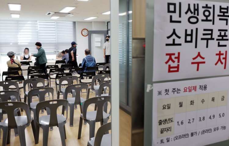생회복 2차 소비쿠폰 신청 첫날인 22일 부산 부산진구 가야2동주민센터에서 시민들이 지원금을 받고 있다.