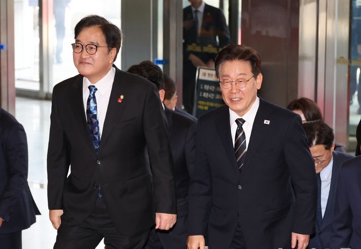 이재명 대통령이 추가경정예산안 시정연설을 위해 2일 서울 여의도 국회에 도착해 우원식 국회의장과 환담장으로 이동하고 있다.