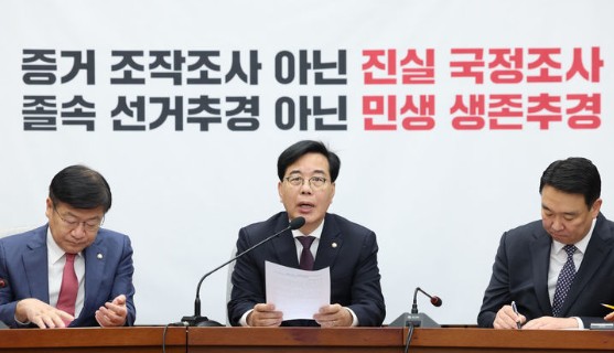 송언석 국민의힘 원내대표가 3일 서울 여의도 국회에서 열린 원내대책회의에서 발언하고 있다.송언석 국민의힘 원내대표는 5일 중앙선거관리위원회가 국민의힘 중앙당으로 '국민투표법 운용기준 안내'라는 제목의 공문을 발송한 사실을 밝혔다.