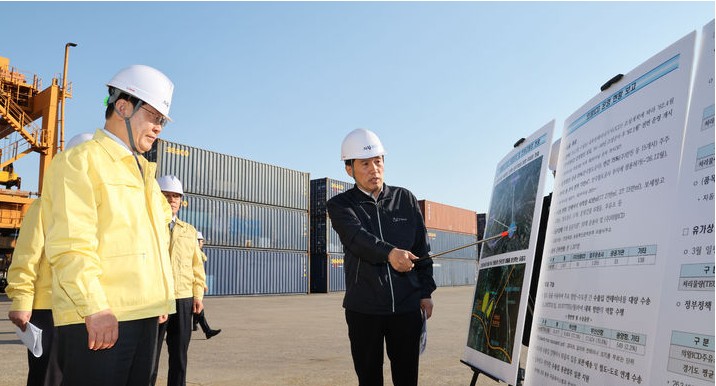 이재명 대통령이 8일 경기 의왕 내륙컨테이너 기지를 방문해 고유가 위기극복을 위한 화물운송·물류업계 현장 간담회를 마친 뒤 운영 현황 보고를 받고 있다