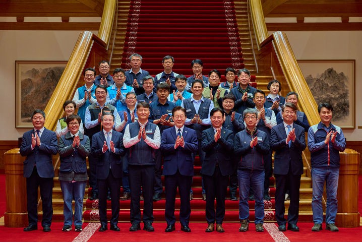 이재명 대통령이 10일 청와대에서 열린 민주노총 초청 간담회에서 양경수 민주노총 위원장 등 참석자들과 기념촬영을 하고 있다. (사진=청와대 제공)