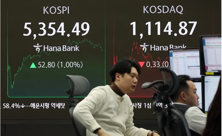 코스피가 종가기준 사상 첫 5500선을 돌파한 12일 서울 중구 하나은행 딜링룸 전광판에 코스피 등 시황이 표시되어 있다. 코스피는 전 거래일(5354.49)보다 16…