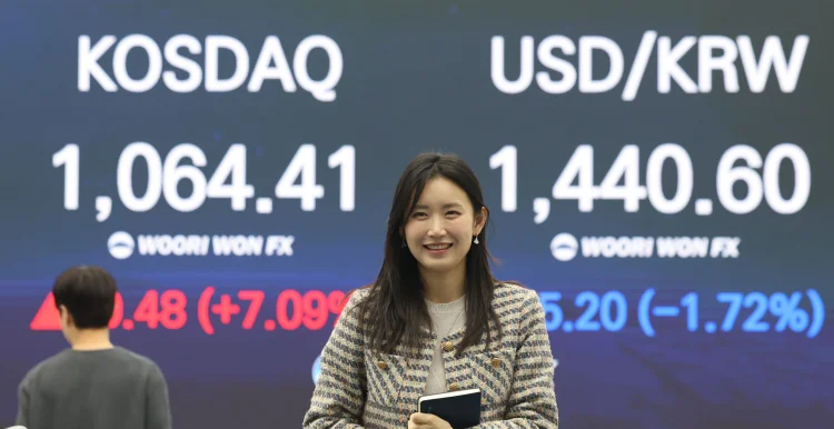 26일 오후 서울 중구 우리은행 딜링룸에서 코스닥 종가가 나오고 있다. 코스닥 지수가 전장보다 70.48포인트(7.09%) 오른 1,064.41로 장을 마치며 4년여만에 천스닥에 탈환했다.