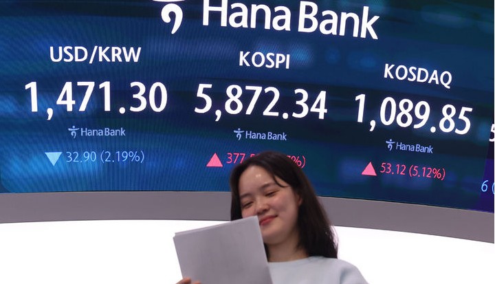 코스피가 전 거래일보다 377.56포인트(6.87%) 오른 5872.34에 마감했다. 코스닥 지수는 전 거래일보다 53.12포인트(5.12%) 상승한 1089.85, 원·달러 환율은 전 거래일보다 33.6원 내린 1470.6원에 마감했다.