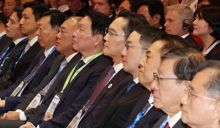 29일 경북 경주예술의전당에서 열린 아시아태평양경제협력체(APEC) CEO 써밋에서 참석자들이 이재명 대통령의 특별연설을 경청하고 있다.왼쪽부터 정용진 신세계그룹 회장, 정기선 HD현대 회장, 신동빈 롯데그룹 회장, 정의선 현대차그룹 회장, 최태원 SK그룹 회장 겸 대한상의 회장, 이재용 삼성전자 회장, 구광모 LG그룹 회장, 장인화 포스코홀딩스 회장, 허태수 GS그룹 회장, 김동관 한화그룹 부회장. (대통령실통신사진기자단)