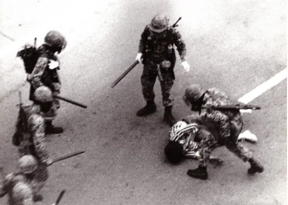 1980년 5·18 광주민주화 운동 당시 무방비 상태의 시민에게 곤봉을 휘두르며 폭력을 가하는 계엄군의 모습. 정씨는 당시를 "한민족으로서 있을 수 없는 일"이라고 기억했다. <저작권자 요청으로 회원사는 사용할 수