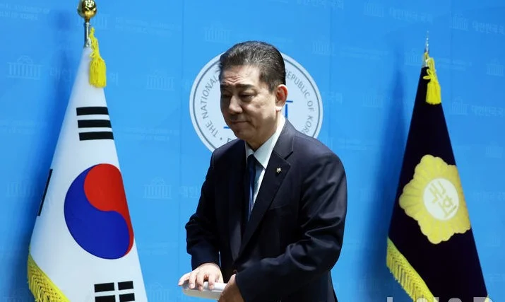 김병기 전 더불어민주당 원내대표가 19일 서울 여의도 국회 소통관에서 기자회견을 마친 뒤 퇴장하고 있다.김병기 무소속 의원의 '차남 숭실대 편입 특혜 의혹'과 관련해 경찰이 숭실대 전 총장을 불러 조사한다.