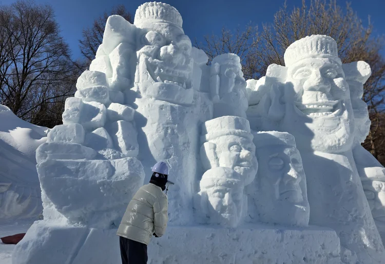 제33회 태백산 눈축제 개막을 하루 앞둔 30일 강원 태백시 태백산국립공원 당골광장에서 눈조각 작품의 마무리 작업이 진행되고 있
