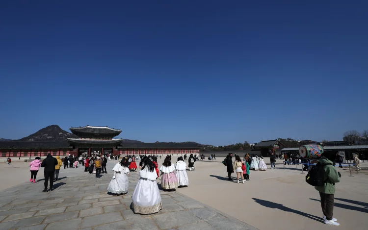 서울 낮 최고기온이 2도를 기록하며 영상 기온을 회복한 1일 서울 종로구 경복궁에서 관광객들이 경내를 관람하고 있다.3일 화요일은 전국이 대체로 맑겠으나 전라권과 제주도는 구름이 많다가 오전부터 차차 맑아지겠다. 또 영하권 기온에 쌓인 눈으로 빙판길과 도로 살얼음이 나타나는 곳이 많겠다.