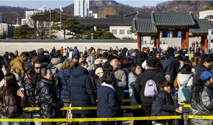 16일 서울 종로구 경복궁 흥례문 광장에서 열린 2026년 병오년 수문장 세화 나눔행사에서 시민들이 세화를 받기 위해 줄 서 있다. 2