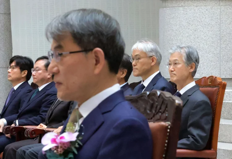 조희대(오른쪽부터) 대법원장, 천대엽 대법관, 노태악 대법관 등이 3일 오전 서울 서초구 대법원에서 열린 노태악 대법관 퇴임식에 자리하고 있다.조희대 대법원장이 대법관 후임자 제청을 미룬 데다 노태악 대법관이 3일 퇴임하면서 대법관 공백 사태가 장기화될 것으로 우려된다.