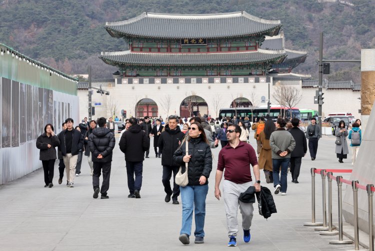 서울 낮 최고기온 15도 등 전국이 10도 이상의 따뜻한 날씨를 보인 27일 오후 종로구 광화문광장에서 가벼운 옷차림의 외국인 관광객들이 걸어가고 있다.22일 일요일은 서해안을 중심으로 짙은 안개가 끼고 내륙은 일교차가 크게 벌어질 전망이다.