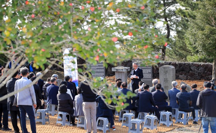 오영훈 제주도지사가 28일 오후 제주 4·3평화공원 내에서 함병선 공적비와 군경 공적비·충혼비를 이설하고 '바로 세운 진실' 안내판 설치 행사에 참석해 발언하고 있다.제주도는 4·3 역사왜곡 논란 비석을 철거하는 대신 4·3평화공원으로 옮기고 그 옆에 객관적 사실을 담은 안내판을 나란히 세웠다.