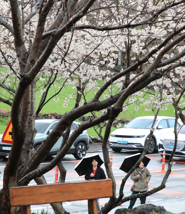 봄비가 내리는 25일 제주시 도두동에서 우산을 든 시민들이 활짝 핀 벚꽃을 감상하고 있다.월요일인 30일은 전국이 대체로 흐린 가운데 전라권과 제주도에서 시작된 비가 점차 전국으로 확대되겠다.