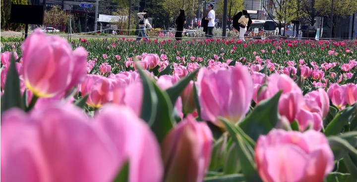 완연한 봄날씨를 보인 12일 오후 서울 종로구 열린송현광장에서 나들이객이 만개한 튤립 사이를 걷고 있다.