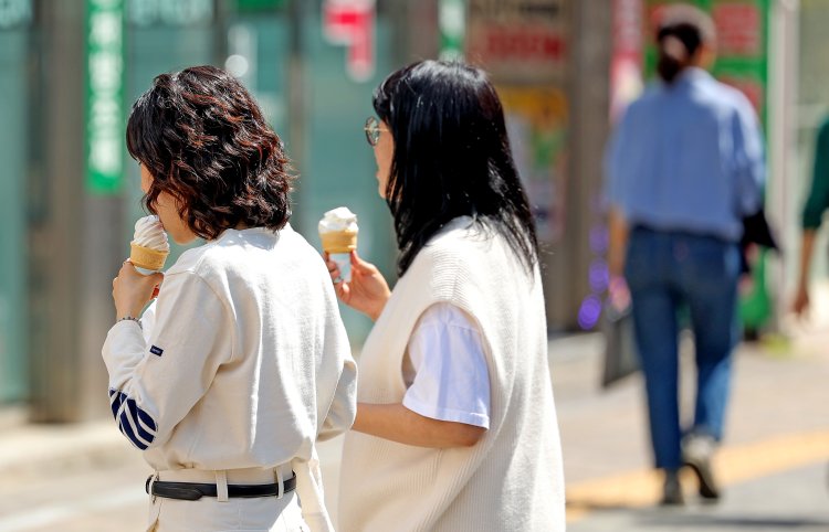 대구 낮 최고기온이 25도까지 오르며 초여름 날씨를 보인 15일 대구 중구 동성로에서 시민들이 아이스크림을 먹고 있다.