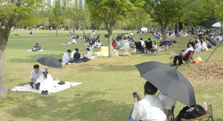 무더운 봄 날씨가 찾아온 18일 전북 전주시 세병공원을 찾은 시민들이 그늘 아래에서 피크닉을 즐기고 있다.일요일인 19일은 제주도에 강한 비가 예보된 가운데 낮 최고기온이 29도까지 오르며 전국 내륙을 중심으로 낮과 밤의 기온차가 크겠다.