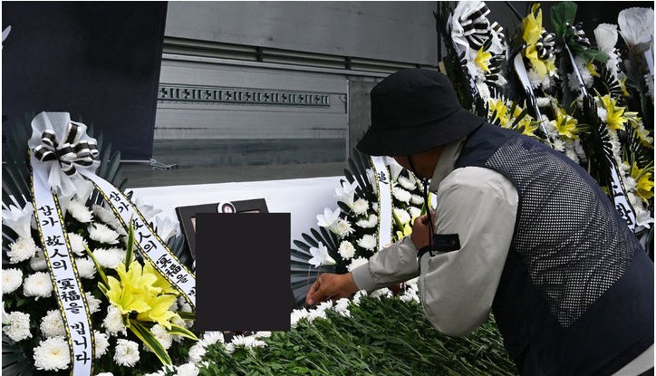 22일 오전 경남 진주시 정촌면 BGF로지스 진주센터 인근에 지난 20일 사고로 숨진 화물연대 조합원 A씨를 추모하는 합동분향소가 차려진 가운데 한 동료가 영전에 분향하고 있다.