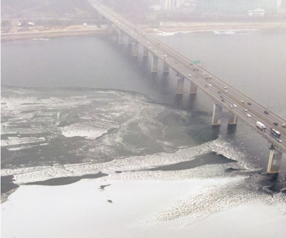 한파가 이어진 12일 경기 하남시 미사대교 인근 얼어붙은 한강 위로 눈이 쌓여 있다.