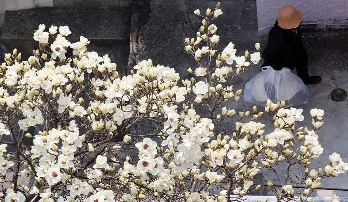 포근한 날씨를 보인 11일 부산 동구의 한 주택가에 목련이 만개해 시민들의 눈길을 사로잡고 있다.