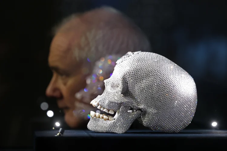 영국 시각미술가 데이미언 허스트(Damien Hirst)가 18일 서울 종로구 국립현대미술관에서 아시아 최초 대규모 개인전 ‘진실은 없어 그러나 모든 것은 가능하지’ 기자간담회 깆고 8,601개의 다이아몬드가 백금 두개골을 장식한 작품 '신의 사랑을 위하여' 작품 앞에서 포즈를 취하고 있다. 죽음은 이렇게까지 아름다워질 수 있는가.