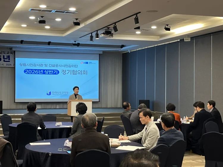 전라남도교육청(교육감 김대중)은 23일 나주에서 청렴시민감사관 및 건설공사 시민감리단 상반기 정기 협의회를 열고 2026년 활동 계획과 ‘청렴 전남교육’ 실현 방안을 논의했다.