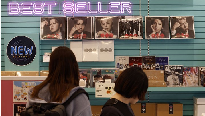 30일 서울 중구 명동 케이메카 명동본점에서 외국인 관광객들이 BTS 앨범 등 굿즈를 살펴보고 있다.