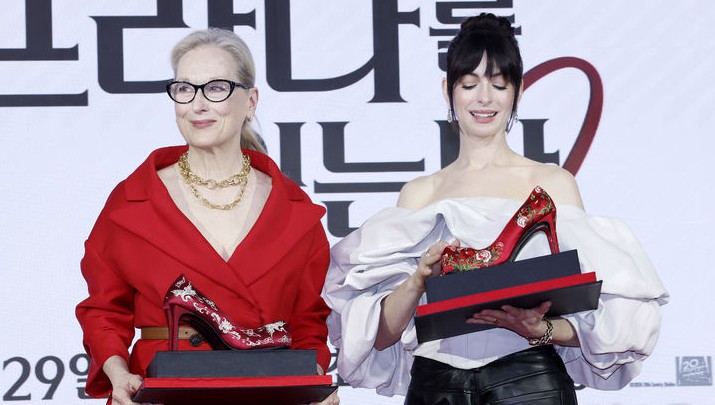 배우 메릴 스트립(왼쪽), 앤 헤서웨이가 8일 서울 종로구 포시즌스 호텔에서 열린 영화 '악마는 프라다를 입는다2' 내한 기자간담회에서 관계자에게 꽃신 선물을 받고 고개 숙여 인사하고 있다.