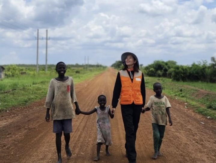 사진 속 조윤희는 우간다의 아이들과 손을 잡고 길을 걸으며 맑을 하늘을 쳐다보고 있다.