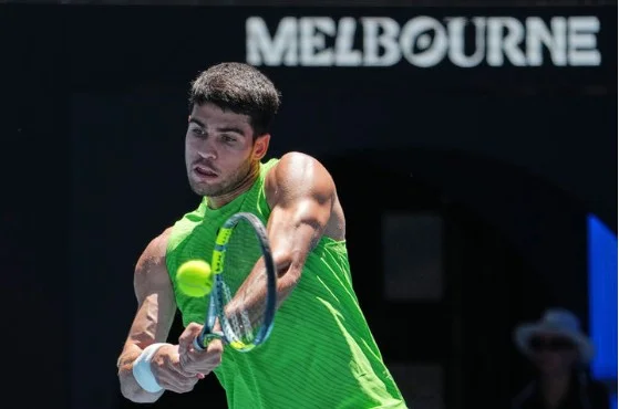 카를로스 알카라스(1위·스페인)가 21일(현지 시간) 호주 멜버른에서 열린 호주오픈 남자 단식 2회전에서 야니크 한프만(102위·독일)과 경기하고 있다. 호주오픈 첫 우승을 노리는 알카라스가 3-0(7-6 6-3 6-2)으로 이기고 3회전(32강)에 올랐다.
